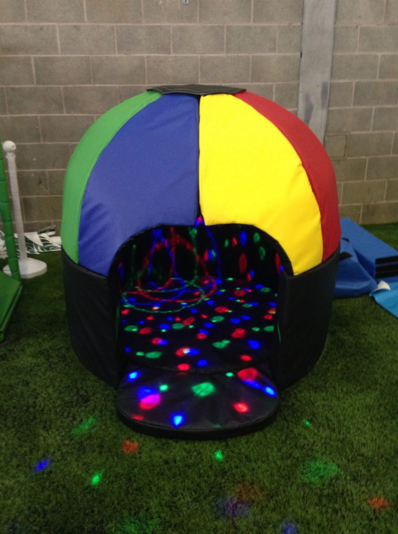 A soft play dome is like a disco dome that has been specially made for very young children. It's a great place for youngsters to spend some time - it has flashing lights, a comfortable padded floor to lie down on, and plenty of treats for the senses. Kids will love lying down in it while they listen to calming music or relax and enjoy everything it has to offer.